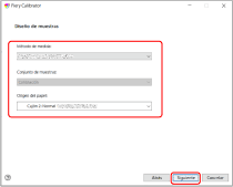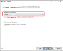 Seleccione el ajuste objetivo de la calibración desde el elemento desplegable [Nombre de calibración] y, a continuación, haga clic en [Siguiente].
