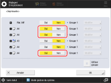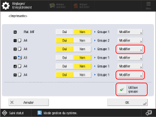 Sélectionner <Utiliser groupe> appuyer sur <Modifier> pour l'alimentation papier