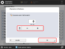 → <Preferenze> → <Impostazioni carta> → <Impostazioni gestione tipo di carta> → selezionare il tipo di carta utilizzato che presenta il problema → premere <Dettagli/Modifica> → <Cambia> per <Regolazione brillantezza> → regolare il valore verso il meno.