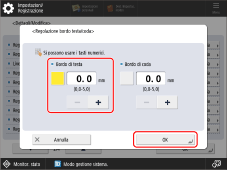 → <Preferenze> → <Impostazioni carta> → <Impostazioni gestione tipo di carta> → selezionare il tipo di carta utilizzato che presenta il problema → premere <Dettagli/Modifica> → <Cambia> per <Regolazione bordo testa/coda> → regolare il valore di <Bordo di testa> verso il segno più.
