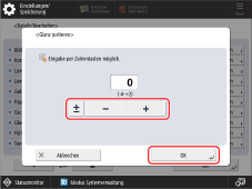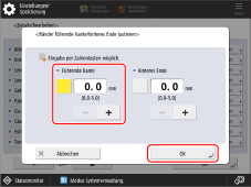 → <Präferenzen> → <Einstellungen Papier> → <Einstellungen Verwaltung Papiertyp> → wählen Sie den verwendeten Papiertyp aus, der dieses Problem aufweist → berühren Sie die Taste <Details/Bearbeiten> → <Ändern> für <Führ./Hintere Ränder just.> → passen Sie den Wert für <Führende Kante> in Richtung des Plus-Endes an.