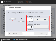 Pulse <-> o <+> para <Salida cara arriba (inverso)> o <Salida cara abajo (normal)> para ajustar el nivel de corrección de curvatura del papel → <Aceptar>.