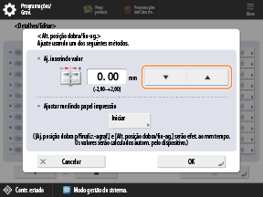 Selecione o tipo de papel que pretende editar na lista → prima <Detalhes/Editar> → <Alterar> para <Ajustar posição da dobra p/finaliz.-agraf.> ou <Alt. posição dobra/fin-ag.>.