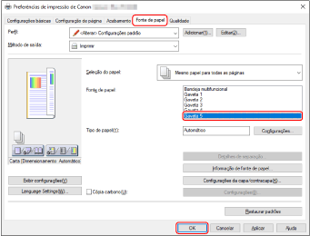 Selecione o separador [Paper source] e especifique as programações consoante abaixo descrito → clique em [OK].