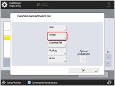Hvis du fjerner markeringen i afkrydsningsfeltet for <Optimal produktivitet>, skifter maskinen fra en papirkilde til en anden, når den papirkilde, der bruges til papirfremføring, løber fuldstændigt tør for papir. Printning afbrydes i et kort øjeblik under dette skifte af papirkilde. Hvis du markerer afkrydsningsfeltet for <Optimal produktivitet>, skifter maskinen fra en papirkilde til en anden, når der er 50 til 100 ark papir tilbage i den papirkilde, der er i brug. Det kan forhindre afbrydelse af et printjob og hjælpe dig med at forbedre produktiviteten.