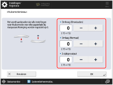 Druk op [-] of [+] onder [Omhoog (Omwisselen)], [Omlaag (Normaal)] of [2-zijdige output] om het niveau van de krulcorrectie te corrigeren en druk vervolgens op [OK].