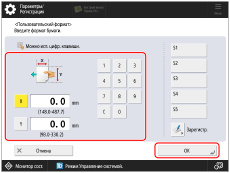 → [Предпочтения] → [Параметры бумаги] → [Параметры управления типом бумаги], выберите торговую марку бумаги, на которой смещено изображение, и нажмите [Детали/Правка] → [Измен.] в разделе <Формат> → [Пользовательский формат], введите там измеренное значение.