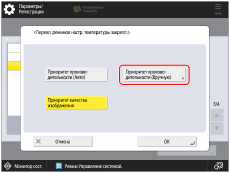 Температура блока термозакрепления в аппарате постоянно регулируется в зависимости от типа бумаги и ее основной плотности. В результате при смене типа бумаги для задания аппарату необходимо настроить температуру в соответствии с бумагой и, возможно, потребуется подождать изменения температуры. По этой причине предоставляется способ увеличения общей производительности путем задания приоритета для плотной или тонкой бумаги.