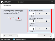 Tryck på [-] eller [+] under [Utm. m frams upp (omvänt)], [Utm. m framsi ned (Normal)], eller [2-sidig utmatning] för att korrigera utslätningsnivån och tryck sedan på [OK].