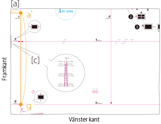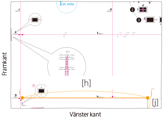 Om provsidan är så liten att <a> inte visas på sidan lägger du till en godtycklig markering <a'> på den röda linjen <c>. Ange sedan avståndet från <a'> till framkanten av pappret i [A]. Ange avståndet från <g> till <a'> i [C].