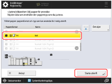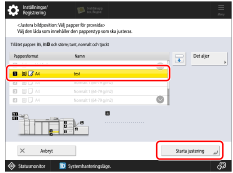 Välj den papperskälla som innehåller den papperstyp som ska justeras → tryck på [Starta utskrift].