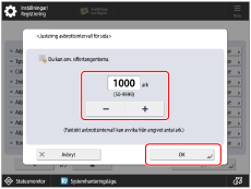 Ange ett värde på mellan 50 och 9 999 ark som avbrottsintervall för justeringssidorna och tryck på [OK].