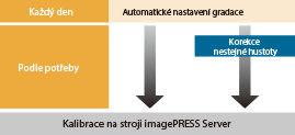 Stroj imagePRESS Server určuje hodnoty CMYK pro tiskovou úlohu na základě předpokladu, že je hustota toneru tiskárny ve standardním vyváženém stavu. V tomto kalibračním režimu se mění výstupní sytost jednotlivých barev CMYK za účelem kalibrace odchylek od standardních hodnot.