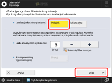 Wybierz [Podajnik] w obszarze <Dostosuj pozycję obrazu: Ustawienia strony testowej>, ustaw liczbę kopii strony testowej, a następnie naciśnij [Dalej].