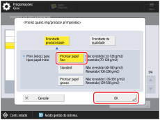 Se selecionar [Prioridade papel fino] e, em seguida, imprimir em papel com uma gramagem base superior a 129 g/m2 (capa 66,6 lb), o tempo que aguarda durante o ajuste da temperatura pode aumentar.