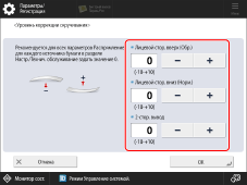 Нажмите [-] или [+] в разделе [Лицевой стор. вверх (Обр.)], [Лицевой стор. вниз (Норм.)] или [2-стор. вывод] и отрегулируйте уровень коррекции скручивания, а затем нажмите кнопку [OK].