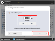 Ange ett värde på mellan 50 och 9 999 ark som avbrottsintervall för justeringssidorna och tryck på [OK].