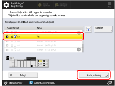 Välj plats för pappret du vill justera och tryck på [Starta justering].