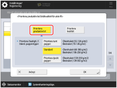Temperaturen i maskinens fixeringsenhet justeras konstant efter typen av papper och papprets basvikt. När du ändrar papperstyp för ett jobb kommer maskinen därmed att behöva justera temperaturen efter pappret och du kan behöva vänta tills temperaturen ändras. Därför tillhandahåller vi ett sätt att öka produktiviteten överlag genom att ange ungefärlig prioritet för tjockt eller tunt papper.
