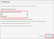 Cambie el número en [Trabajos guardados en la cola Impresos:] y haga clic en [Guardar].