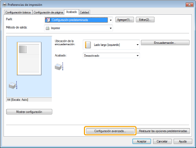 Para obtener las instrucciones acerca de cómo acceder a la pantalla del controlador de impresora, consulte "Impresión" y "Configuración de las opciones de impresión predeterminadas".