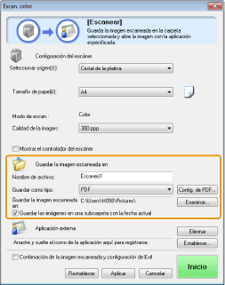 Muestra la ubicación en la que se guardará la imagen escaneada al seleccionar una opción distinta a [PDF (agregar página)] para [Guardar como tipo]. Para guardar la imagen en otra ubicación, haga clic en [Examinar], seleccione una carpeta y haga clic en [Aceptar].
