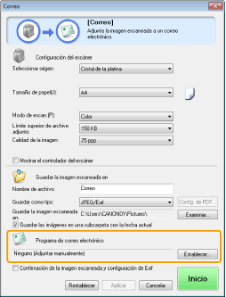 Este botón aparece en lugar de [Guardar] si se ha seleccionado una aplicación para [Programa de correo electrónico] o [Aplicación externa]. Puede reenviar las imágenes leídas a la aplicación.