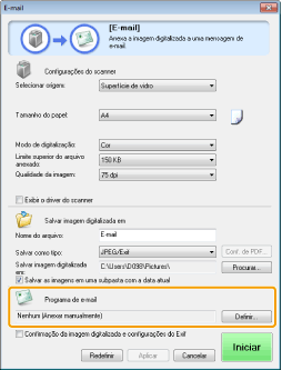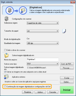 Marque a caixa de seleção [Confirmação da imagem digitalizada e configurações do Exif] ([Confirmar a imagem digitalizada] para o botão [PDF]).