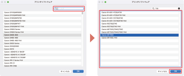 検索フィールドに、プリンタの機種名に含まれる数字を入力 → 検索結果から該当するドライバを選択 → [OK]をクリック
