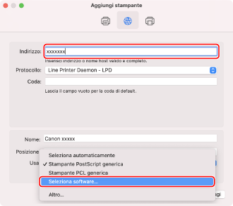 Immettere l'indirizzo IP della stampante utilizzata in [Indirizzo].