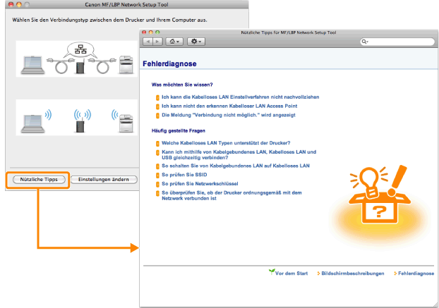 Wenn beim Festlegen der Verbindungseinstellungen ein Problem auftrittKlicken Sie auf [Nützliche Tipps] links unten auf dem Bildschirm und lesen Sie die Hilfeinformationen. |