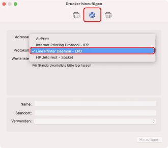 IP], und wählen Sie dann [Line Printer Daemon – LPD] unter [Protokoll] aus.