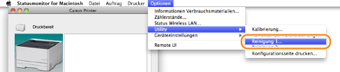 Wählen Sie im Menü [Optionen] des Statusmonitors die Option [Utility] → [Reinigung] oder [Reinigung 1] aus.