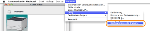 Wählen Sie im Menü [Optionen] im Statusmonitor die Option [Utility] → [Konfigurationsseite drucken] oder [Benutzerdatenliste].