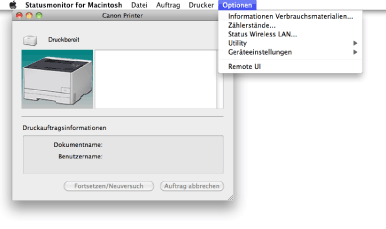 Wenn der Drucker mit einer Bonjour-Verbindung registriert ist, kann das Remote UI nicht über das Menü [Optionen] gestartet werden. Starten Sie das Remote UI mit einer der folgenden Methoden. Wählen Sie den verwendeten Drucker im Dialogfeld [Drucker & Scanner] aus, klicken Sie auf [Optionen & Füllstände] und klicken Sie dann auf [Druckerwebseite anzeigen] auf der Registerkarte [Allgemein]. |