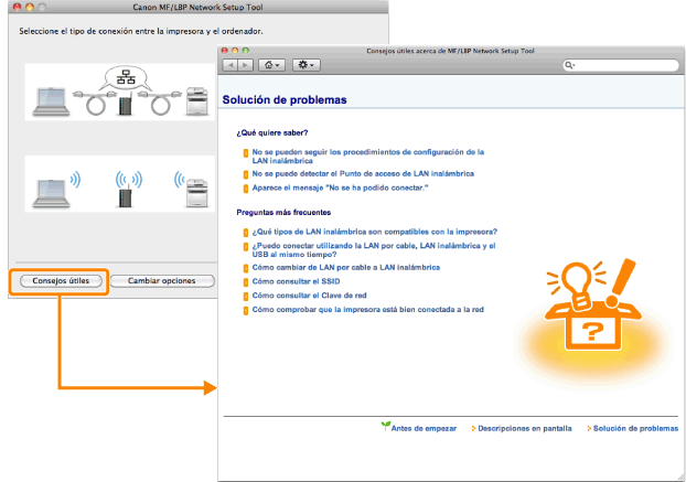 Si tiene algún problema durante la configuración de la conexiónHaga clic en [Consejos útiles] en la parte inferior izquierda de la pantalla y consulte el contenido de la ayuda. |