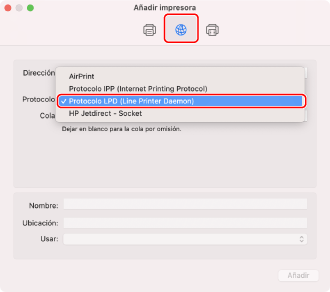 IP] y seleccione [Protocolo LPD (Line Printer Daemon)] en [Protocolo].