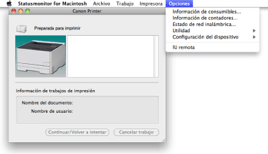 Si se ha registrado la impresora con una conexión Bonjour, no podrá iniciarse la IU remota desde el menú [Opciones]. Inicie la IU remota con uno de los métodos siguientes. Seleccione la impresora que utiliza en el cuadro de diálogo [Impresoras y escáneres], haga clic en [Opciones y recambios] y, a continuación, haga clic en [Mostrar página web de la impresora] en la pestaña [General]. |