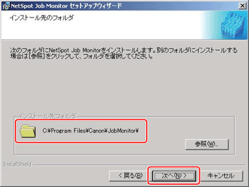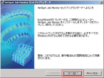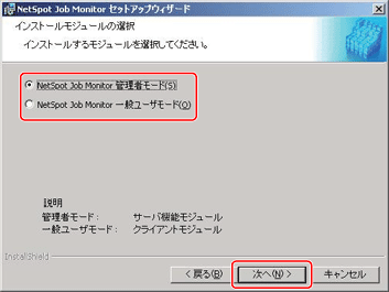 Windows NT 4.0/2000/XPでAdministratorsの権限がある場合は、[NetSpot Job Monitor 管理者モード]または[NetSpot Job Monitor 一般ユーザモード]を選択したあと、[次へ]をクリックします。
