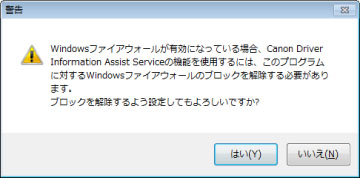 デバイスをネットワーク接続してインストールする場合、次のダイアログが表示されることがあります。デバイス情報取得機能を使用する場合は、[はい]を選択してください。Canon Driver Information Assist Serviceに対するWindowsファイアウォールのブロックが解除され、デバイス情報取得機能を使用できるようになります。