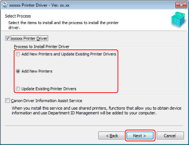 [Process to Install Printer Driver]: Select this if necessary if a driver is already installed.