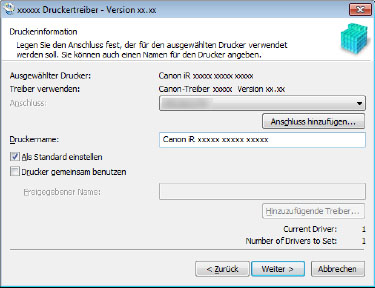Wenn Sie den Gerätenamen ändern oder das Gerät als Standard festlegen möchten, wählen Sie [Druckerinformationen angeben] → Klicken Sie auf [Weiter].