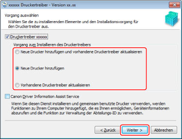 [Canon Driver Information Assist Service]: Wählen Sie dies aus, wenn Sie die Funktion zum Abruf der Geräteinformationen verwenden möchten.
