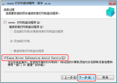 取消驱动程序选择 → 选择[Canon Driver Information Assist Service] → 单击[下一步]。
