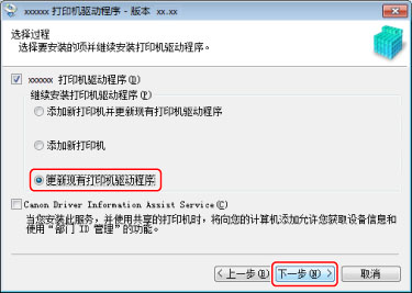 为[继续安装打印机驱动程序]选择[更新现有打印机驱动程序] → 单击[下一步]。
