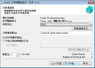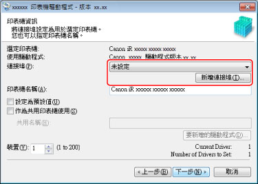 如果您已新增或選取網路印表機連接埠,將無法設定 [印表機名稱] 和 [作為共用印表機使用]。