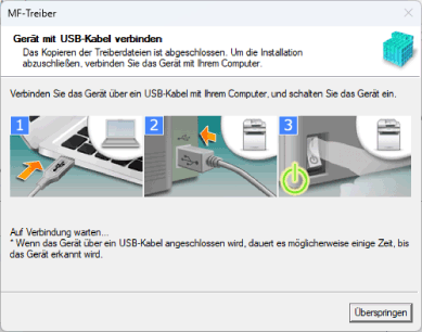 Hier wird das Verfahren zur Installation für ein über USB angeschlossenes Gerät mit [Einfache Installation] von der mitgelieferten DVD-ROM beschrieben. Bei diesem Verfahren werden neben dem MF-Treiber auch Standardsoftware und elektronische Handbücher installiert.