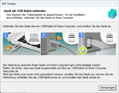 Wenn der folgende Bildschirm angezeigt wird, schließen Sie das Gerät über ein USB-Kabel an den Computer an → schalten Sie das Gerät ein.