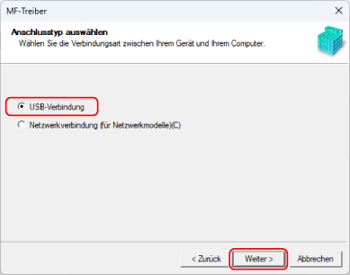 Wenn der folgende Bildschirm angezeigt wird, wählen Sie [USB-Verbindung] aus → Klicken Sie auf [Weiter].