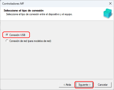 Si aparece la siguiente pantalla, seleccione [Conexión USB] → haga clic en [Siguiente].